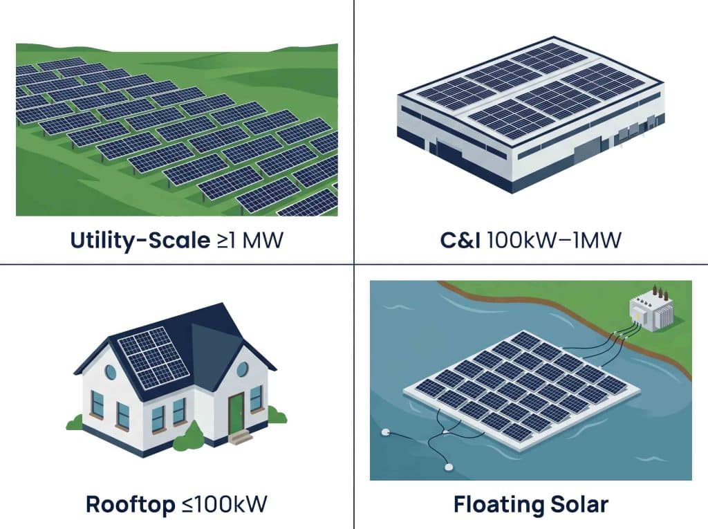 A solar power plant is an electrical generation facility that converts sunlight into grid-compatible AC electricity using PV panels, inverters, transformers, and associated protection equipment. Three types exist by scale: utility-scale (≥1 MW), commercial & industrial (C&I, 100 kW–1 MW), and rooftop/distributed (≤100 kW).